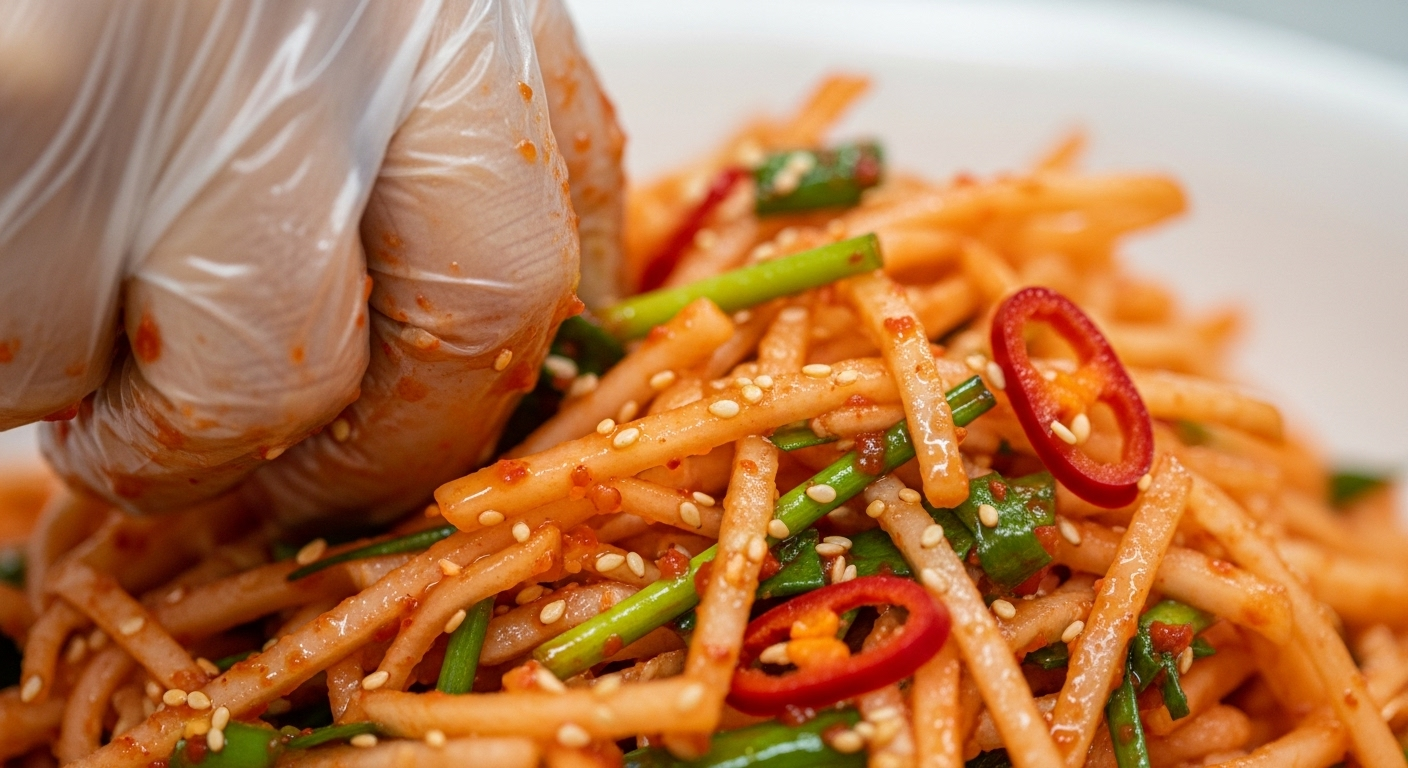 젓가락으로 섞는 것보다 손으로 직접 무쳐야 양념이 겉돌지 않고 무에 착 달라붙는답니다. (위생장갑은 필수!) 이 과정에서 풋내가 나지 않도록 주의하는 것이 정말 중요해요.