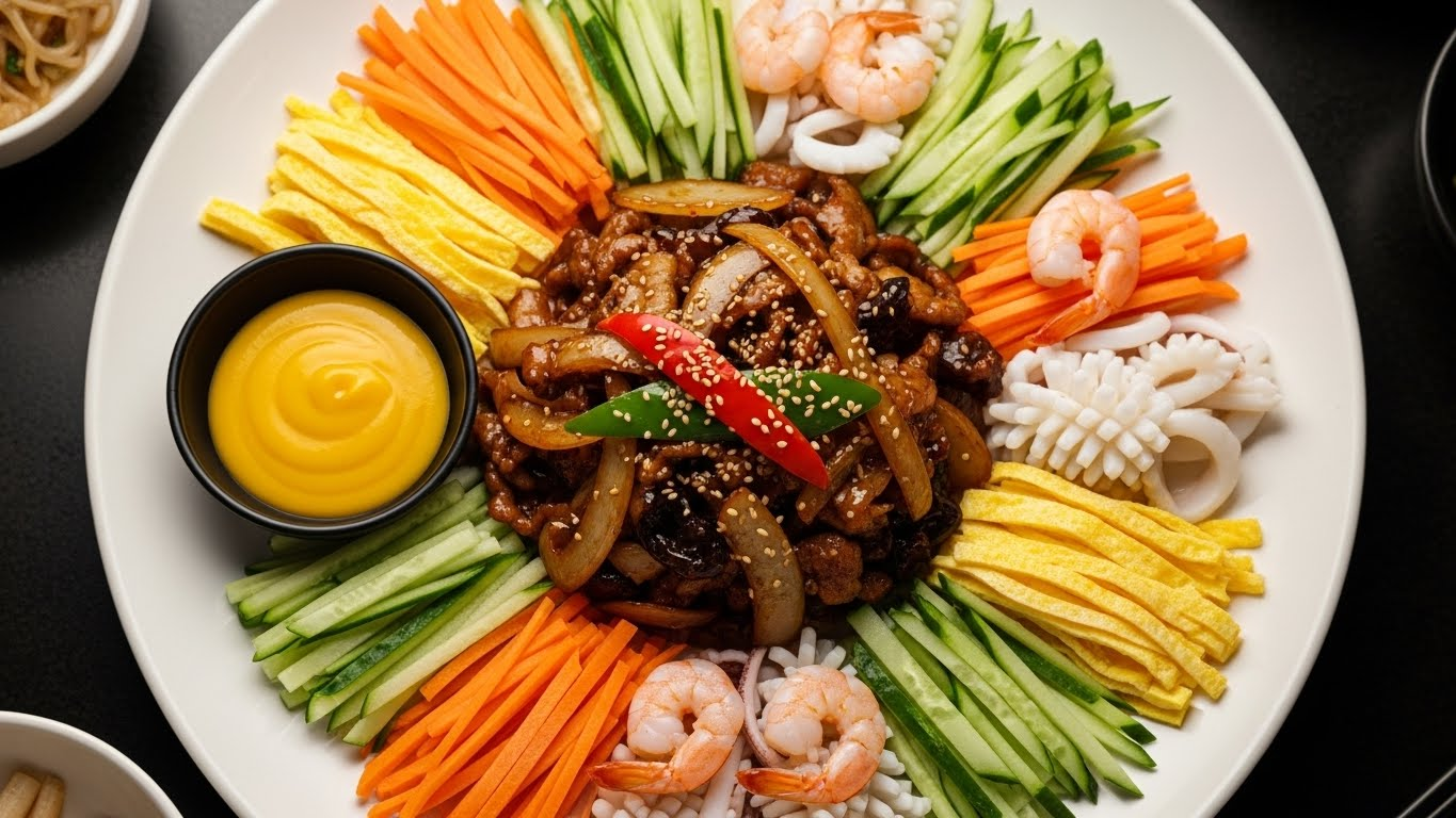 양장피 레시피의 화룡점정은 바로 플레이팅입니다. 큰 원형 접시를 준비해 주세요. 가장자리에 준비한 채소와 해산물을 색깔이 겹치지 않게 빙 둘러 담아줍니다. 예를 들어 당근 옆에는 오이, 오이 옆에는 계란 지단, 이런 식으로 색 대비를 주면 훨씬 화려해 보여요.