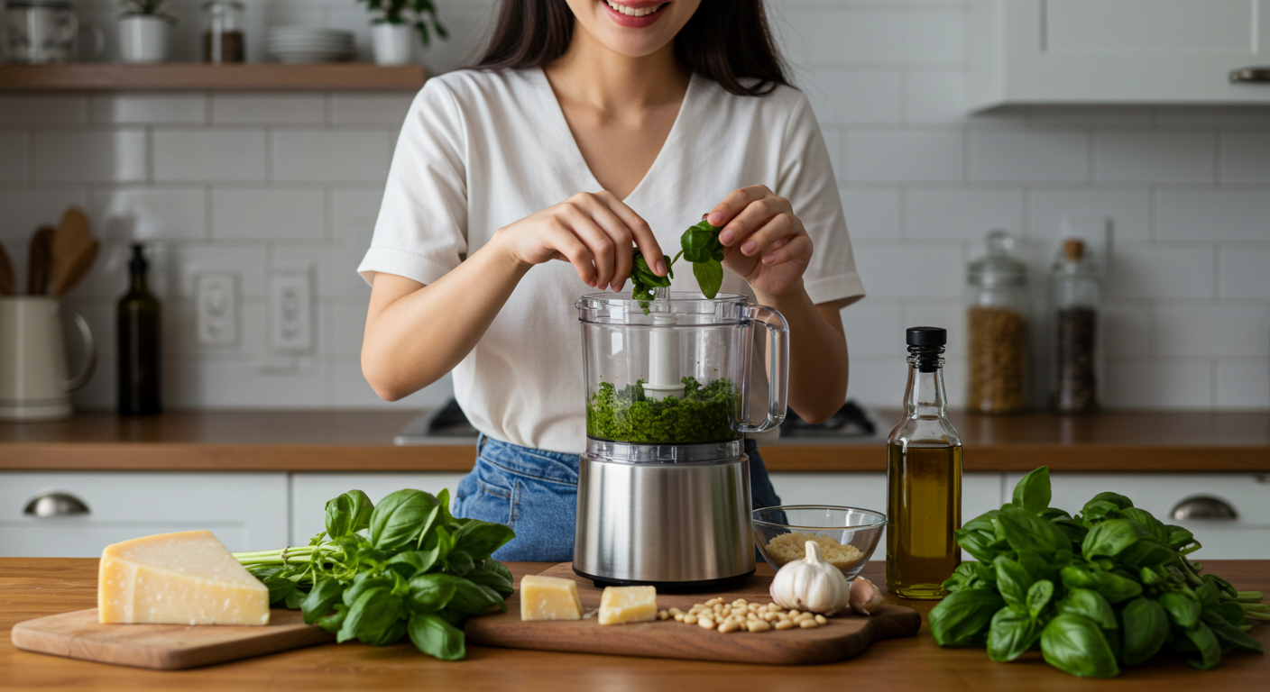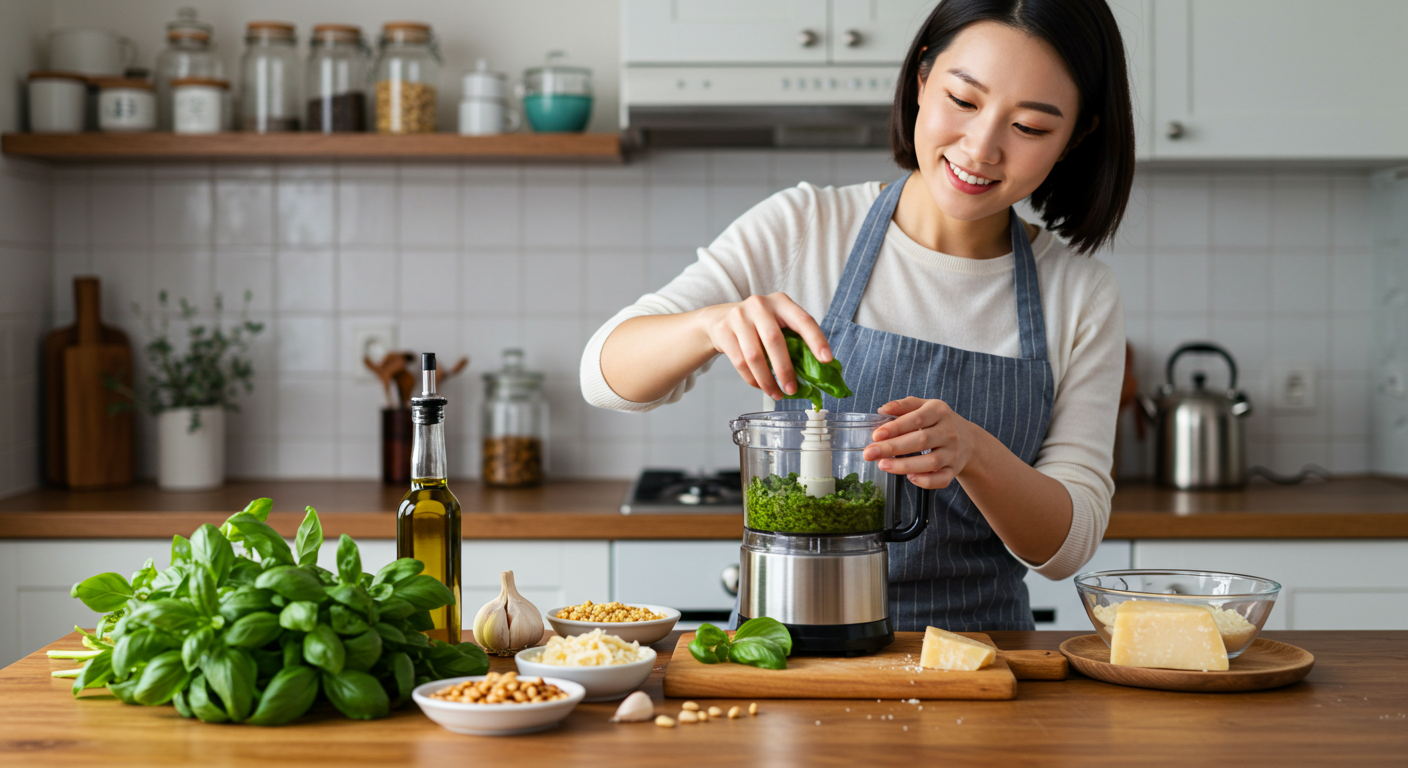 "많은 분들이 바질페스토를 직접 만드는 것을 어려워하지만, 사실 푸드 프로세서나 믹서기만 있으면 10분 내외로 뚝딱 만들 수 있는 가장 간단한 소스 중 하나입니다. 신선한 재료가 주는 풍미는 그 어떤 시판 소스도 따라올 수 없죠."